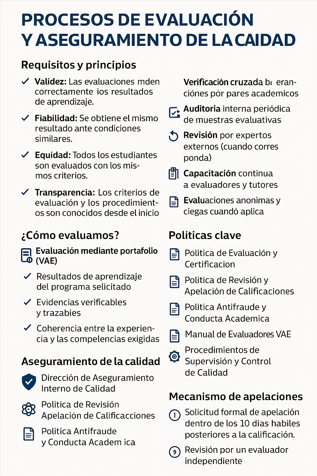 Cumplimos con los estándares exigidos por organismos como OFS y seguimos principios fundamentales para la evaluación: