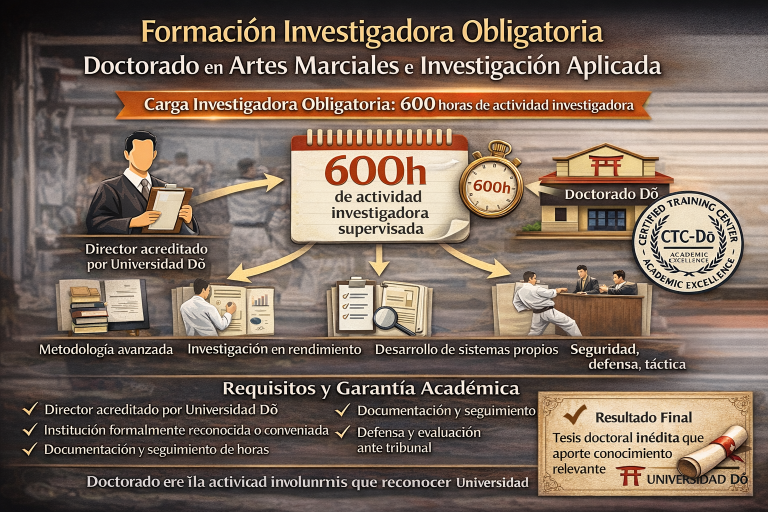 El Doctorado de la Facultad de Artes Marciales de Universidad Dō incorpora un componente obligatorio de actividad investigadora supervisada, orientado al desarrollo científico, académico y metodológico dentro del ámbito marcial.